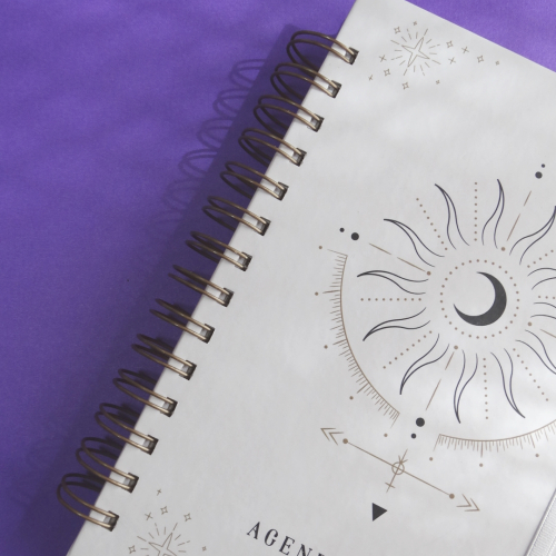 Agenda astrológica con vista semanal, incluye mucha info sobre como armar tu carta natal, signos zodiacales, elementos, eclipses y más