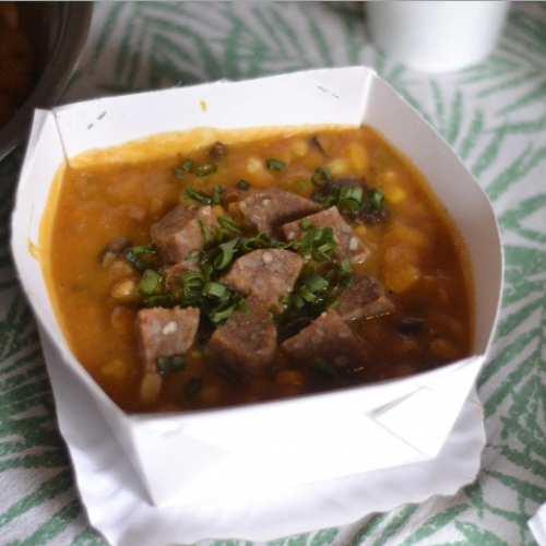 Locro c maíz blanco, alubias, calabaza, cebolla y morrón, poroto colorado, choris de lentejas y arroz sin gluten. 100% vegetal