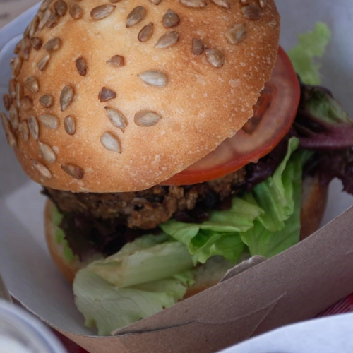 Pan de fermentación natural c burguer de hongos y lentejas sin gluten, lechuga, tomate, coleslaw y aderezo tipo mc. 100% vegetal