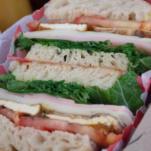 Focaccia de masa madre c/ tofu orgánico grillado, mix de verdes, tomate, pickles de cebolla morada, jamón y queso a base de plantas y mostaza c/miel de caña. 100% vegetal