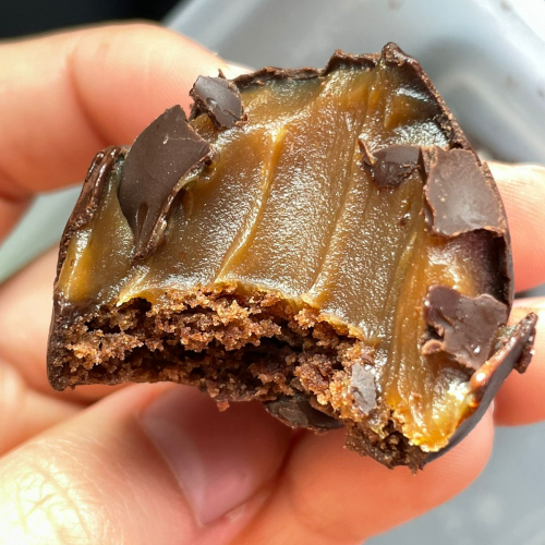 Conitos con galletita de cacao amargo, dulce de leche vegetal a base de proteína de arvejas, bañado en choco semiamargo