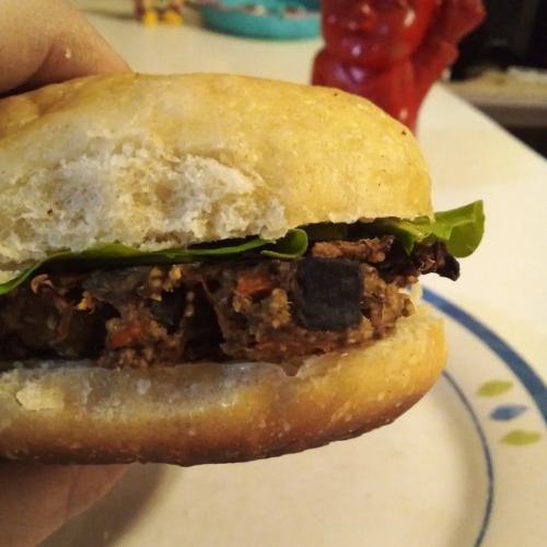 Sandwich con pan de papa, medallon de berenjena, hojitas de rucula y veganesa