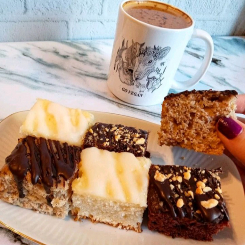 Bandejita con 6 cuadrados dulces surtidos: - Brownie - Limón - Banana, canela y chocolate