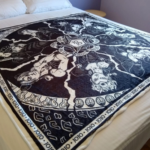 Una manta de 1,40m x 1,40m, de tela súper suave y no pesada, 100% poliéster, ideal para tirarse en el sillón o la cama a leer un buen manga. El diseño está inspirado en el anime Jojo´s Bizarre Adventure, y está hecho con mucho amor ❤️
