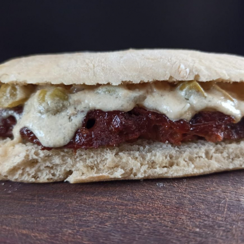 Sandwich de seitán con quesofu (a base de tofu) con salsa de cebolla y aceitunas
