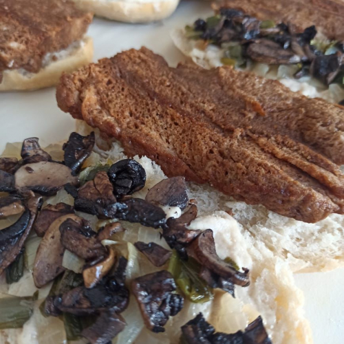Sándwich de seitán con quesofu (a base de tofu) con salsa de champiñones, portobellos y cebolla de verdeo.