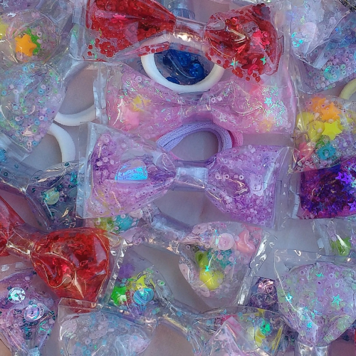 Moños transparentes plásticos rellenos de gel con glitter y cuentas.