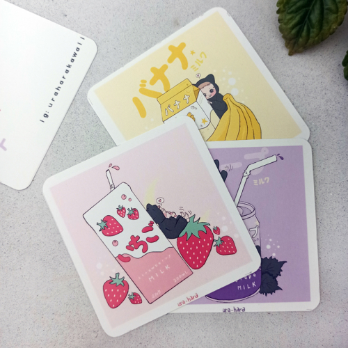 Set de tres postales cuadradas (frutilla, banan y uva).