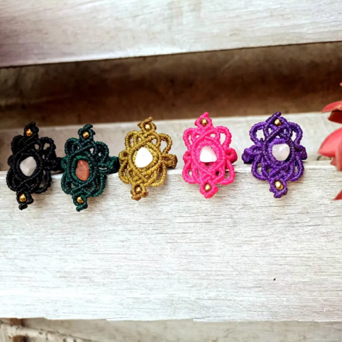 Anillos de hilo encerado, con mostacillas y escallas de piedras naturales , las piedras pueden varias, todos los colores.