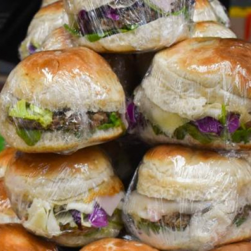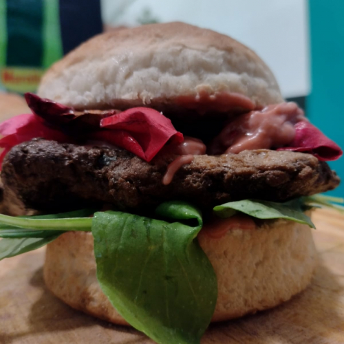 Medallón de soja al ajo y vino tinto con lechuga, repollo, jamón, queso, huevo y aderezo de ajo y vino tinto.