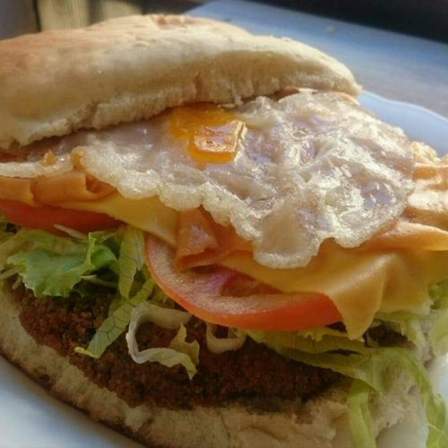 Milanesa de garbanzo con lechuga, tomate, jamón, queso y huevo frito.